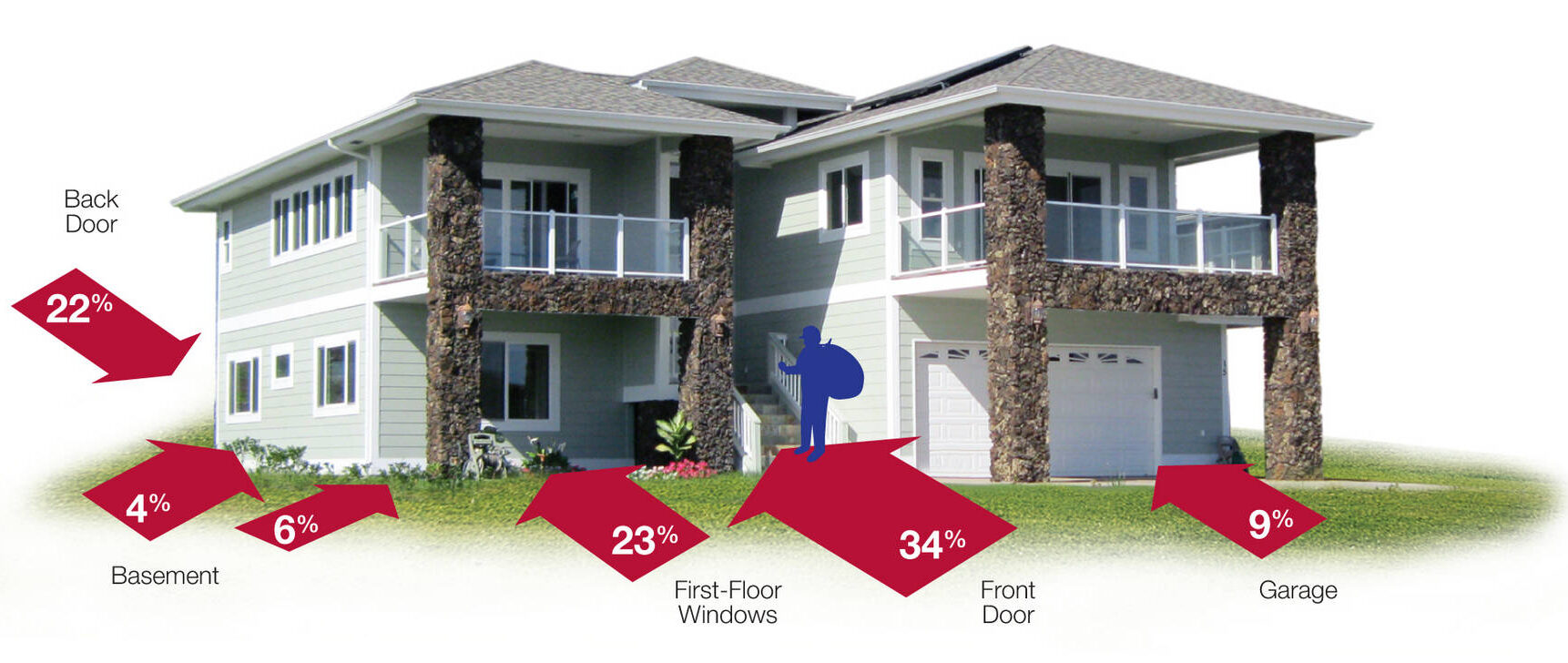 79% of break-ins occur through a front door, back door, or window. Damaging or removing doors and window panes is common in both forced and attempted entries.